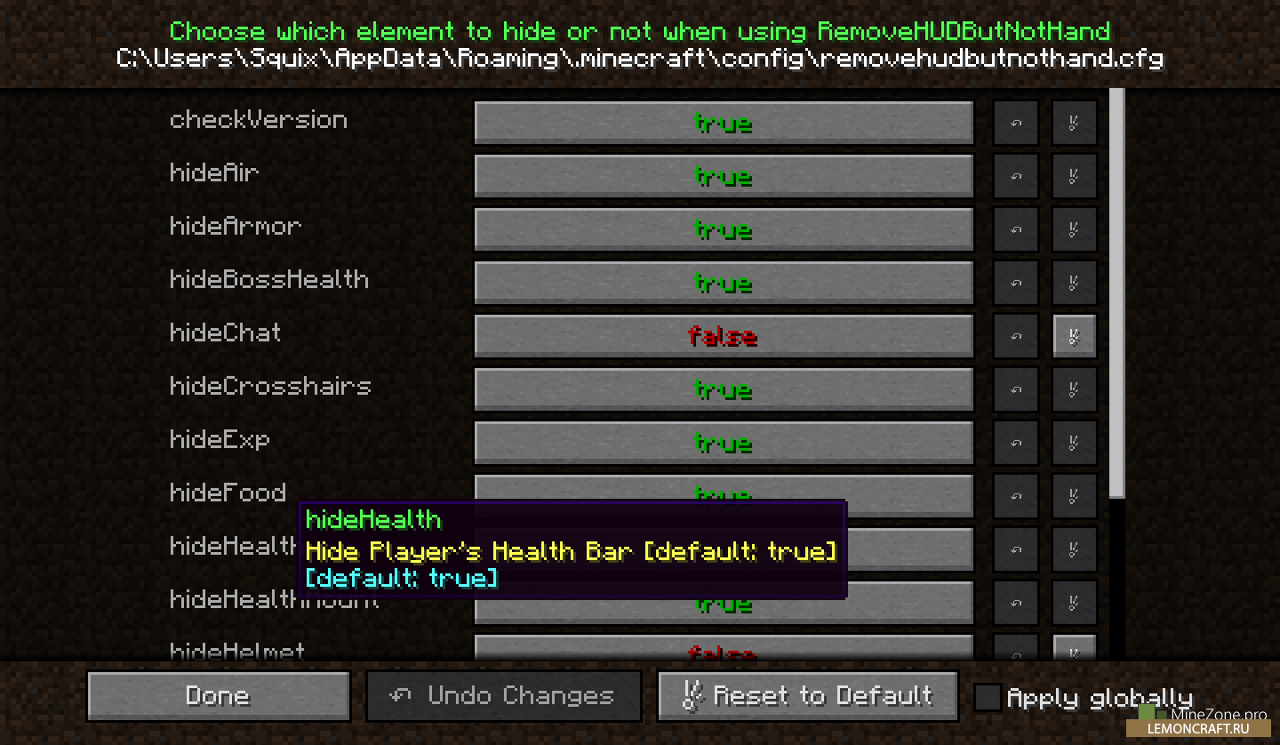 С помощью мода Remove HUD but Not Hand теперь можно убрать все лишнее с экрана. Применив этот мод вы будете видеть только свою руки и окружающий мир. Все ненужное, в данный момент игры, можно убрать с экрана, чат, линию здоровья и др. Для управления модом есть интуитивно понятное меню.